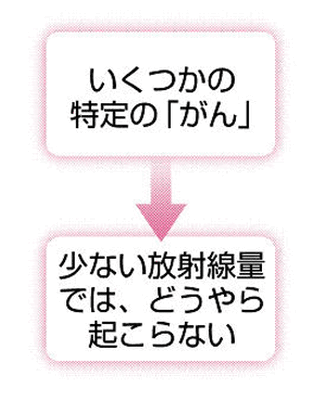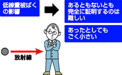 「放射線の管理」の上では、低線量被ばくの影響はあるともないとも完全に証明するのは難しい、というだけでは話が進みません。たくさんの放射線(高線量)を浴びたときに分かっている放射線のリスク…
