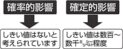脱毛や出血・下痢・やけどといった症状は、大量に被ばくすると誰であれ「必ず」生じる一方、被ばく量が一定以下であれば「誰にも」生じず、「確定的影響」と呼ばれました。 放射線…