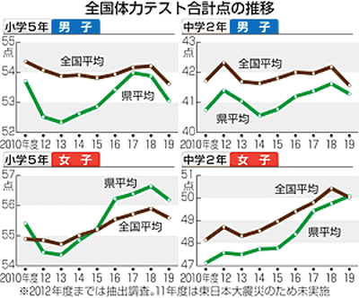 「体力テスト」福島県男子...平均未満 19年度、中2女子は伸びる