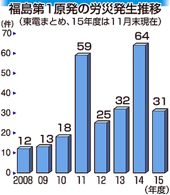 福島第1原発での労災件数は作業員数に比例して増加、2014(平成26)年度が64件で最多となった。15年11月末時点では31件(前年同月比24件減)だが、同年8月には事故後の同原発で3…