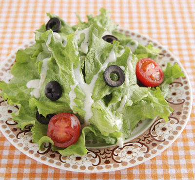 1人分61キロカロリー、塩分0.8グラム(1)2人分でグリーンリーフ50グラム、プチトマトと種なしのブラックオリーブ各2個、酢小さじ2、コ…