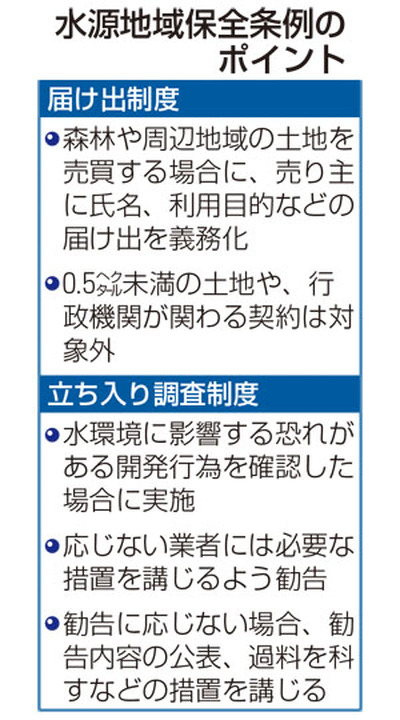 福島県は、本県の豊かな水資源を守るため制定した県水源地域保全条例の対象地域に、湯川村を除く58市町村の計2331区域を指定する方針を固めた。国有林以外の森林がある地域を大字単位で指定、…