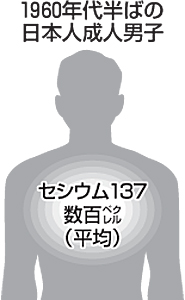 1950年代以降、数百回以上行われた核実験のため、多くの人工の放射性物質が全世界にばらまかれました。その影響から、当時の日本人の体内や、毎日の食事、排せつした尿中からも放射性セシウムが検出されていたというデータが残っています。 60年代半ば、日本人成人男子の体内には「平均」して、数百ベクレルの放射性セシウム137が検出されていました。単純に比較すると、2015年現在の南相馬市の内部被ばく検査で...