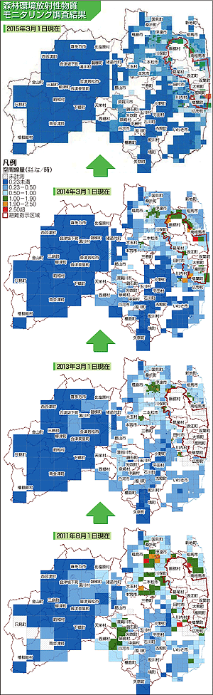 県が行った県内の森林1193カ所の空間放射線量調査(2015年3月1日現在)で、原発事故による避難指示解除準備区域内134カ所の平均値は毎時1.07マイクロシーベルトだった。 同区域の調査は南相馬市など9市町村で実施。同区域内134カ所の最大値は同3.35マイクロシーベルト、最小値は同0.37マイクロシーベルトだった。会津、南会津の両地域の調査地点は全て同0.23マイクロシーベルト未満。県は原...