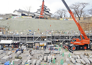 震災とその後の余震で石垣16カ所の修復工事が必要となった白河市の国指定史跡「小峰城跡」は、最も被害が大きかった「本丸南面」など5カ所で工事が完了した。昨年4月には三重櫓(やぐら)の一般公開が再開されるなど復旧が進んでいるが、完全復旧は2018(平成30)年末までかかる見込みで、被害の深刻さを物語る。 工事が完了していない11カ所のうち、現在工事が進められているのは城の南側にある「竹之丸南面西」...