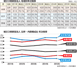 信用調査会社東京商工リサーチによると、震災で大きな被害を受けた本県、宮城、岩手の3県では、震災から2015(平成27)年10月までに1万7367社が新しく設立された。このうち、売上高が判明した4860社の売上高合計は7328億円。従業員数が判明した4718社の従業員合計数は3万8243人に上ることが分かった。 被災3県は、震災後から前年を上回るペースで新設法人が増加し、伸び率は全国平均を大きく...