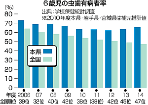 子どもの虫歯対策も喫緊の課題だ。県によると、県内の虫歯のある6歳児の割合は2014(平成26)年度に65.5%と47都道府県で最も多く、全国平均の47.34%を大幅に上回っている。他の年代でも、1歳6カ月は2.34%(13年度)で全国38位、3歳児は27.4%(同)で全国45位、12歳児は46.2%(14年度)で全国32位と、全体的に高い割合にある。 県は、虫歯の子どもが多い要因について、震災...