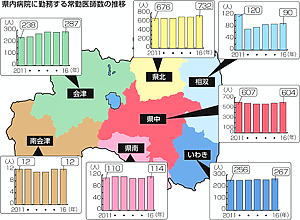 本県の病院に勤務する常勤医師数は、従来他の都道府県と比べて少なかったが、東日本大震災と東京電力福島第1原発事故が追い打ちをかけ、事態を深刻化させた。現在は回復傾向にあるが、楽観はできない。県民が安心して暮らすことができるよう、医師の本県定着、研修医の増加などに向けた施策の展開が求められている。 県内病院の常勤医師数は、震災と原発事故の影響により、震災前と比べてマイナスの状況が続いていたが、20...