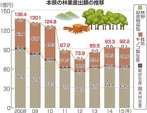 木材や栽培キノコなどの本県の林業産出額は原発事故前の2010(平成22)年が約125億円だったのに対し、15年は73%の約92億円。このうち、栽培キノコ類の産出額は10年の約49億円に対し、15年は約29億円と59%にとどまる。 一部地域の栽培キノコに国の出荷停止指示が出され生産量が回復しないことや、原発事故の風評などが要因とみられる。 また、本県はキノコ栽培に使うキノコ原木の全国有数の産地だ...
