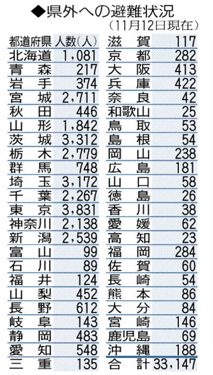 福島県外への避難状況(11月12日現在) 福島県から県外への避難者数は3万3147人(11月12日現在)で、前回調査(10月12日時点)から88人減った。 県が3日発表した。都道府県別の避難者数は、東京都が3831人で最も多い。 復興庁による毎月の調査に基づき、県が集計した。 この記事をSNSで伝える: