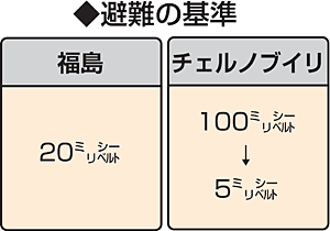 これまで数多くの原子力事故が世界中で記録されている中、1986年のチェルノブイリ原子力発電所と福島第1原子力発電所での事故の二つがレベル7(=深刻な事故)とランク付けされています。この二つはレベルが同じに分類されてはいるものの、状況やその後の対策など異なる点が多くあります。 どちらの事故後も年間の予想される被ばく「量」に基づいて避難が決められました。しかしその値は異なりました。 チェルノブイリ...