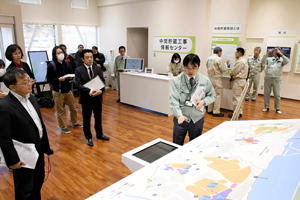 環境省は31日、大熊町小入野の国道6号沿いに、中間貯蔵工事情報センターを開所する。東京電力福島第1原発事故に伴う県内の除染で生じた土などを保管する中間貯蔵施設(大熊町、双葉町)の工事概要や進捗(しんちょく)状況などを周知する施設で、開所に先立ち29日、報道陣に公開された。