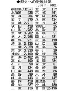 県外への避難状況(3月11日現在) 福島県から県外への避難者数は3万2476人(3月11日現在)で、前回調査(2月7日時点)から155人減った。県が発表した。 都道府県別の避難者数では東京が3736人、 茨城が3282人、埼玉が3135人 。復興庁による毎月の調査に基づき、県が集計した。 この記事をSNSで伝える: