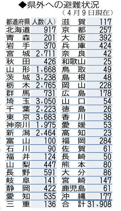 県外への避難状況(4月9日現在) 福島県から県外への避難者数は3万1908人(4月9日現在)で、前回調査(3月11日時点)から568人減った。県が発表した。 都道府県別の避難者数は、東京が3683人 、茨城が3238人、埼玉が3050人 。 復興庁による毎月の調査に基づき、県が集計した。 この記事をSNSで伝える: