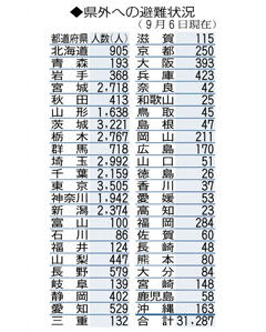 県外への避難状況(9月6日現在) 福島県から県外への避難者数は3万1287人(9月6日現在)で、前回調査(8月9日時点)から87人減った。県が7日までに、発表した。 都道府県別の避難者数では東京が3505人、茨城が3221人など。 復興庁による毎月の調査に基づき県が集計した。 この記事をSNSで伝える: