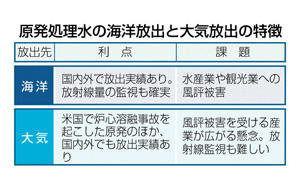 小委の初会合から約3年で議論が節目を迎えた。五つの処分方法のうち、海洋放出は基準を満たせば放出が世界的に認められており、水蒸気放出は炉心溶融した米・スリーマイルアイランド原発で実施済みだ。いずれも被ばく線量が通常生活で自然に被ばくする線量より大幅に低いという試算もあり、風評被害を少しでも抑制したい狙いがある。