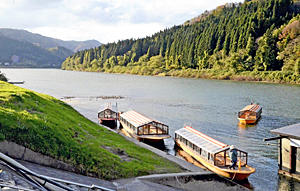 芭蕉が経験した最上川下りの面影を伝える観光船の船着き場=山形県戸沢村古口