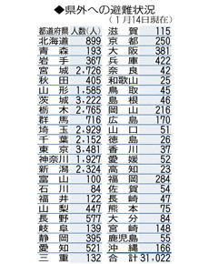 県外への避難状況(1月14日現在) 福島県から県外への避難者数は3万1022人(1月14日現在)で、前回調査(昨年12月9日時点)から82人減少した。県が3日、発表した。 都道府県別の避難者数では、東京が3481人、茨城が3222人、埼玉が2929人 。 復興庁による毎月の調査に基づき、県が集計した。 この記事をSNSで伝える:
