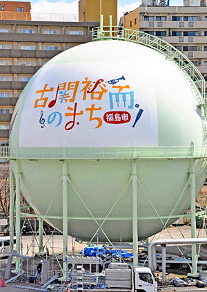 福島市出身の作曲家古関裕而と妻金子(きんこ)夫妻をモデルにしたNHK連続テレビ小説(朝ドラ)「エール」が30日から放送されるのを前に、福島ガス(同市)の大型ガスタンクに「古関裕而のまち福島市」のロゴマークが25日、登場した。 同社はJR福島駅から南に約400メートルの場所に位置しており、近くを通る東北新幹線の車窓からもロゴマークを見ることができる。市民や乗客に古関の出身地と功績をアピールしよう...