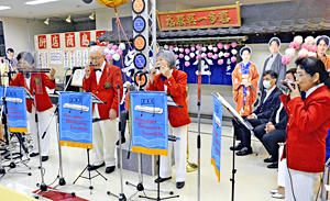 福島市大町のチェンバおおまちで19日から始まった朝ドラ「エール」で使われた衣装や小道具などが並ぶ「エール展」。開所式では「福島ハーモニカアンサンブル」が出演し、古関裕而作曲の「福島小夜曲」「高原列車は行く」の2曲を披露し、息の合ったハーモニーを会場に響かせた。 出演したのは、複音担当で県ハーモニカ協会長の木村正義さん(伊達市)と栗花ソヨノさん(同)、コード担当の加藤悦子さん(福島市)、バス担当...