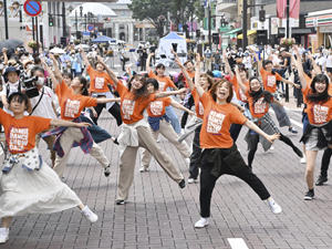 福島市の福島駅前通りを歩行者天国にして古関裕而メロディーを響かせるイベント「古関メロディーinホコ天 明日へのエール」が10日行われた。市内ダンススタジオのメンバーが古関の行進曲などに合わせて踊りを繰り広げ、通りを歩く人たちに元気を届けた。 福島民友新聞社、市振興公社の主催。ブラスアンサンブル「輝響」(福島市)が演奏する古関の名曲とともに、福島市のダンスファクトリーKマニフィック、波恵ダンス・...