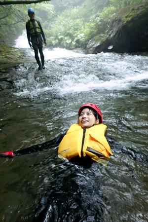 沢遊び「シャワーウオーク」でずぶぬれの記者。安達太良山の中腹を流れる烏川(からすがわ)を上流に向かって歩き、大自然と一体となってきた。(報道部・安達加琳) 目の前には魚も上流に上れない「魚止滝(うおどめのたき)」。落差約7メートルほどか。その存在感に息をのむ。「滝の裏側に行ってみましょう」。滝の音に紛れ、案内してくれているあだたらアクティビティガイドの加藤正広さん(62)の声がうっすらと聞こえ...