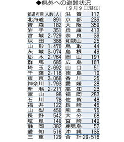 福島県外への避難状況(9月9日現在) 福島県から県外への避難者数は2万9516人(9月9日現在)で、前回調査(8月7日時点)から79人減少した。県が発表した。 都道府県別の避難者数は、茨城が3074人、東京が3068人、栃木が2764人など。 復興庁による毎月の調査に基づき、県が集計した。 この記事をSNSで伝える: