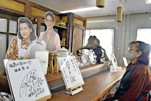 NHK朝ドラ「エール」で喫茶店「喫茶バンブー」を営む梶取夫婦役の野間口徹さんと、仲里依紗さんの等身大パネルが13日、バンブーの再現セットがある、福島市の古関裕而記念館前広場休憩所にお目見えした。市がエール放送期間の11月中まで展示する。 2人の等身大パネルと直筆サイン入りの色紙を展示。等身大パネルはカウンターの奥に置かれ、来場者を出迎えてくれる。 また、2人のお気に入りシーンや来場者に向けたメ...