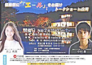 NHK朝ドラ「エール」に出演している村野鉄男役の中村蒼さんと藤丸役の井上希美さんのトークショーは31日午後6時から、白河市の南湖公園翠楽苑屋外特設ステージで開かれる。 白河市、白河観光物産協会の主催、NHK福島放送局の後援。中村さんと井上さんがドラマ撮影中の思い出や感想などを語り合う。当日は午後5時30分開場。雨天中止。 定員150人。入場無料だが事前申し込みが必要(県内在住者対象。1人の申し...