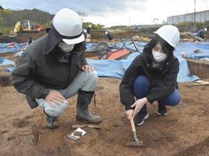 いつの間にか遺跡の発掘調査に挑戦することになった。発掘調査のイメージは湧くが、右も左も分からない。「新発見に立ち会えるかも」。とりあえず楽観的に考え、発掘作業中の福島市平石にある「町畑・吉治下遺跡」に足を運んだ。(報道部・遠藤真菜) 遺跡は福島盆地南部の丘陵の裾野。国道13号のバイパス路線「福島西道路」の延伸事業に伴い昨年から調査している場所だ。今年は動物を捕まえるため縄文時代に作られたとみら...