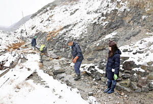 源泉から二本松市の岳温泉までの「湯樋(ゆどい)」を保守管理する湯守へのトライは、最後の作業となる源泉地帯での確認作業に移った。(報道部・弥永真依) 源泉からお湯が流れているのかを確認するため、1カ所ごとに見回る作業だ。親方の武田喜代治さん(69)に連れられ源泉地帯にたどり着いたが、想像と違う光景が広がっていた。 源泉地帯が土砂に埋まっていた。勝手にお湯の湖が一面に広がる光景を想像していたが、現...