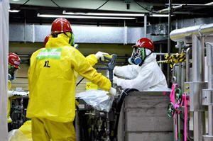 この日の作業は、原子炉格納容器に制御棒を出し入れする装置のメンテナンスを行う部屋の除染。作業員5人がビニール製の防護服を着込み作業に当たっていた。