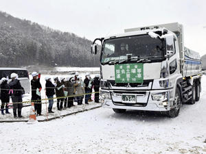 同日、しらかわ地域仮置き場で完了式が行われ、鈴木和夫市長が「改めて地域の方々にお礼と感謝をしたい」とあいさつした。その後、関係者らが最後の除去土壌を載せたトラックを見送った。