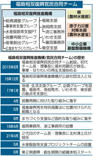 一般に福島相双復興推進機構は、官民合同チームとも呼ばれるが、その理由は【組織図】を見ると分かる。機構は経済産業省や東電、民間企業からの出向者らで構成される「民」の組織だ。福島市の機構事務所などには、県や農林水産省などの「官」のメンバーも常駐している。この二つの組織が連携することで、官民合同チームを形成している。 組織が発足したのは、震災と原発事故から4年余りが経過した2015年8月だった。当時...