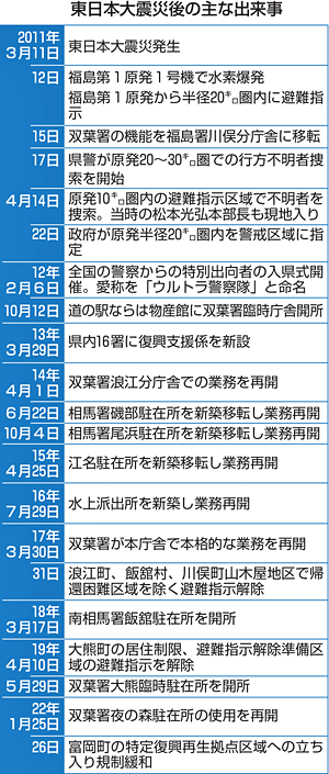 東京電力福島第1原発事故や津波被害により、浜通りの一部の警察署や交番などは使用ができなくなり、一時的に拠点を失った。復興の進展とともに使用の再開を進め、被災地の治安を支えている。 福島第1原発から20キロ圏内にある双葉署(富岡町)は事故後、立ち入り制限を受けたことから福島署川俣分庁舎に拠点を移した。制限緩和を受け、2012年に道の駅ならはに臨時庁舎を開所し、17年に本庁舎で本格的に業務を再開し...