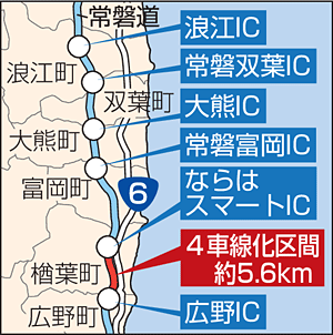 広野IC―ならはスマートIC間で4車線化の具体的な見通しが立ったことから、残るならはスマートICから浪江ICまでの整備促進も期待される。内堀雅雄知事は国交省の発表を受け「選定された区間の早期整備と、残る区間の4車線化に向け、引き続き関係機関と取り組む」とコメントした。