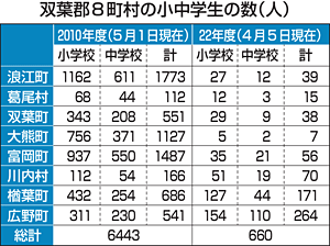 双葉郡8町村の小中学生は震災前の2010(平成22)年度(5月1日現在)が6443人だったのに対し、22年度(4月5日現在)は660人で震災前と比べて1割ほどにとどまっている。全国で少子化が進む中、双葉郡では児童生徒数の急減が課題となっている。 各校は震災以降、少人数を補うため、他校との合同授業をはじめ、郷土の歴史や文化、魅力に理解を深める「ふるさと創造学」などの特色ある教育に取り組んでいる。...