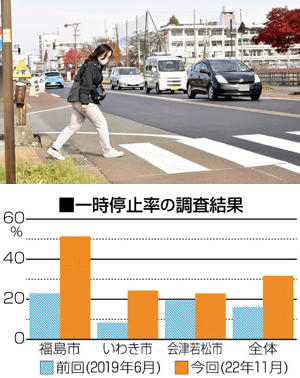 信号機のない横断歩道を渡ろうとするとき、車は停止するのか―。日本自動車連盟(JAF)が毎年公表している信号機のない横断歩道での車の停止率で今年、本県は55.3%で全国9位となった。3.5%にとどまり全国ワースト9位だった2018年調査から改善したが、いまだ4割強が停止していない。実態はどうか、福島民友新聞社が県内3カ所で調べた。(報道部・熊田紗妃) 調査は19年に続き2回目で、前回の停止率は16...