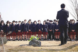 この日は、本校舎と新地校舎(新地町)の石碑、祈念樹に生徒が集い、黙とうをささげた。続いて本校舎で、消防団員の長男を震災で亡くした同市磯部の阿部洋子さんが講話し、全校生徒約365人が聞き入った。