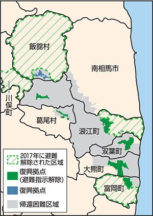 浪江町と川俣町山木屋地区、飯舘村で2017年3月31日、富岡町で同4月1日に避難指示が解除されたのは、居住制限区域、避難指示解除準備区域だった地域。帰還困難区域が残るが、特定復興再生拠点区域(復興拠点)の浪江町室原、末森、津島、大堀各地区で今年3月31日、富岡町夜の森地区などで4月1日に避難指示が解除された。飯舘村長泥地区の復興拠点は大型連休ごろに解除される見通し。