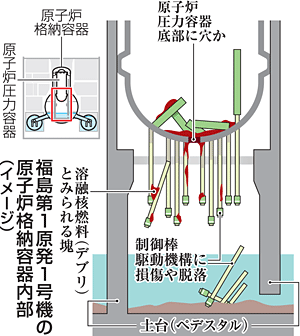 東京電力福島第1原発事故から12年が経過し、炉心溶融(メルトダウン)を起こした1~3号機の状況が少しずつ明らかになってきた。人が近づいて作業することができないほど放射線量が極めて高く、廃炉工程で最難関とされる溶融核燃料(デブリ)の取り出しに向け、1~3号機はどうなっているのか。現状を探った。 1号機、圧力容器土台の損傷大 東京電力は、1号機の原子炉格納容器で行った内部調査で、原子炉圧力容器を支...