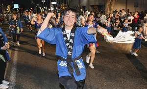 本番の日がやってきた。福島わらじまつり初日の4日が練習の成果を見せる舞台。熱く焼けたアスファルトの上でわらじおどりに挑んだ。 舞台は国道13号。片道約1キロのコースを30分間、時計回りにパレードする。福島市の目抜き通りの中心に立つことだけでも貴重な体験だ。大観衆の中、パレードが始まった。 大わらじを先頭に13団体、約960人の出場者が一斉に動き出した。「民友法被」に袖を通し、同僚らと踊り始めた...