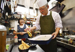 不動の人気 天丼 県や市の庁舎、会社の事務所が並ぶ街の一角に、変わらないおいしさを求めて客が吸い込まれる。いわき市の「お食事どころ天政(てんまさ)」は創業から33年、自慢の天丼で市民の胃袋を満たしてきた。「久しぶりに来ても同じ味。それがいいよね」。味を守り続けてきたマスター根本守さん(64)は料理への信念を語る。 創業以来、天丼は不動の看板メニュー。エビ2本にイカや季節に合わせた魚、野菜3品が...