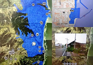 1階エントランスホールに設けた大型タッチパネルディスプレーで利用できる。震災と原発事故の被災地の地図や空中写真を並べて表示し、震災の津波浸水域を重ねて見ることができる体験型コンテンツ。