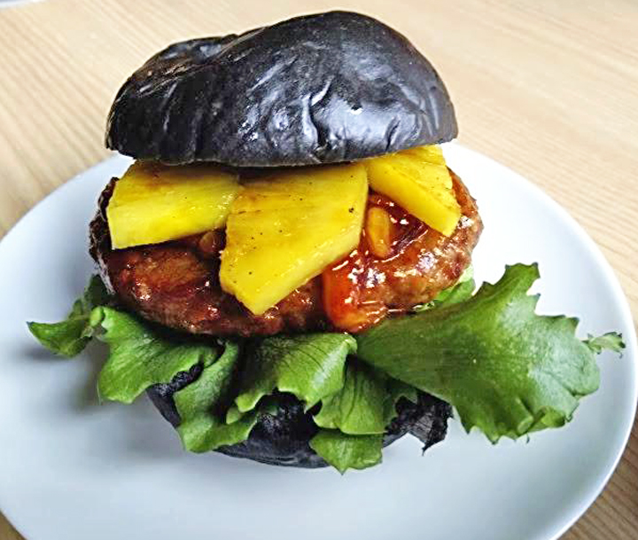 ■石炭アロハバーガー 「炭鉱の町」「フラの町」をイメージして誕生。炭を練り込んだ黒いバンズ、果物屋のフルーツを使ったBBQソースがおいしさを引き立てる。▼メニュー 〈1〉石炭アロハバーガー 650円 〈2〉石炭アロハチーズバーガー 700円 〈3〉クレープ各種 500~800円 〈4〉チームカラーフローズン フルーツソーダ 650円 〈5〉8月限定 石炭桃チキバーガー 800円 〈6〉8月限定桃も...
