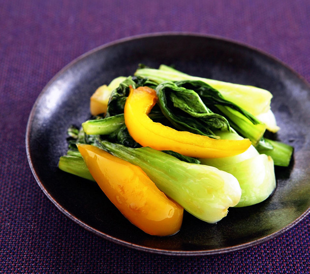1人分60キロカロリー、塩分1.0グラム(1)2人分でチンゲン菜2株、黄パプリカ60グラム、A(塩少々、オイスターソースと酒各小さじ1、鶏がらスープのもと小さじ1/2)を用意します。(2)チンゲン菜は長さを半分にし、芯は縦4等分に割きます。パプリカはへたと種を除いて乱切りにします。Aをまぜて合わせ調味料を作ります。(3)フライパンにサラダ油小さじ2を熱し、チンゲン菜の芯を入れて色良く炒めます。パプ...
