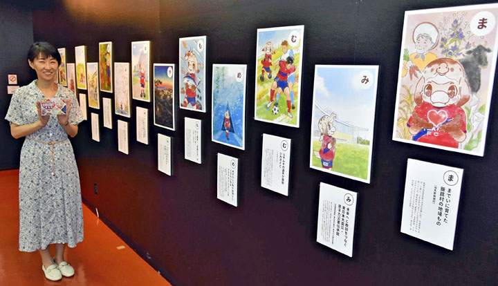 サッカーJ2いわきFCのマスコットキャラクター「ハーマー&ドリー」が浜通りの各所を巡り、伝統文化や特産品、行事に触れる姿をモチーフにした「はまどおりかるた」を44点展示。かるたは金沢さんが約3年がかりで完成させたもので、商品として販売も行っている。また浪江町の高瀬川渓谷や同市の勿来海岸など、各地の自然風景を描いたアクリル画16点も並び、金沢さんの”浜通り愛”あふれる個展となっている。