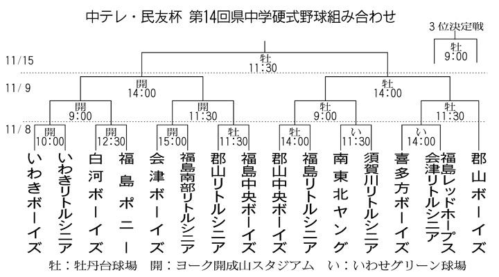 福島県内の中学硬式野球チームが所属リーグの枠を超えて対戦する中テレ・民友杯第14回県中学硬式野球大会は11月8日、郡山市のヨーク開成山スタジアムなど3球場で開幕する。組み合わせ抽選会が20日までに郡山市で開かれ、対戦カードが決まった。 県中学硬式野球大会実行委員会、福島民友新聞社、福島中央テレビの主催。大会は11月8、9、15日の3日間の予定で、県内のリトルシニア、ヤング、ボーイズ、ポニー各...
