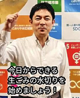 各ショート動画は1本約40秒で構成されている。「生ごみの水切りで減量!」ではペットボトルとごみネットを使ったごみの水切りの仕方を説明。椎根市長は動画で「今日からできる生ごみの水切りを始めましょう」と語りかけている。