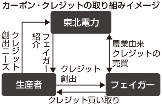 東北電は農家向けのカーボンクレジットの流通支援を手がけるフェイガー(東京都)と連携し、クレジットの生成から販売まで一貫して行う体制を整える。既にJA大潟村(秋田県)が賛同しており、来年度からクレジットの創出に取り組む。購入したクレジットは、東北電のイベントや事業所で排出される温室効果ガスを相殺するほか、顧客からの需要に応じて販売する。
